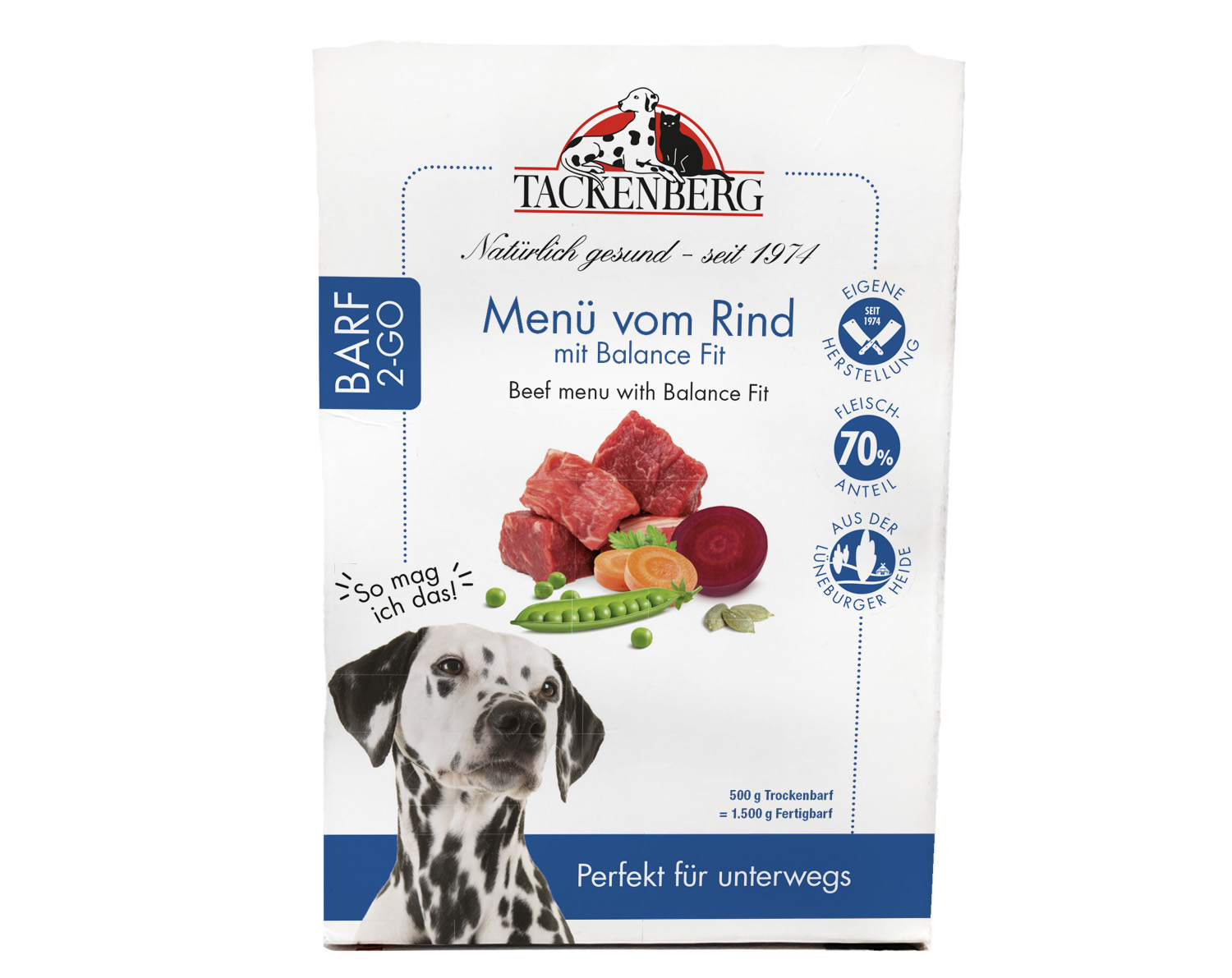 BARFen im Büro, im Urlaub oder ohne Tiefkühlfach? TACKENBERG hat mit BARF 2 GO die Lösung – bei gewohnt erstklassiger Qualität! Starke 70 % schonend getrocknetes Muskelfleisch vom Rind machen den Großteil dieses praktischen 100 g Menü-Bechers aus.