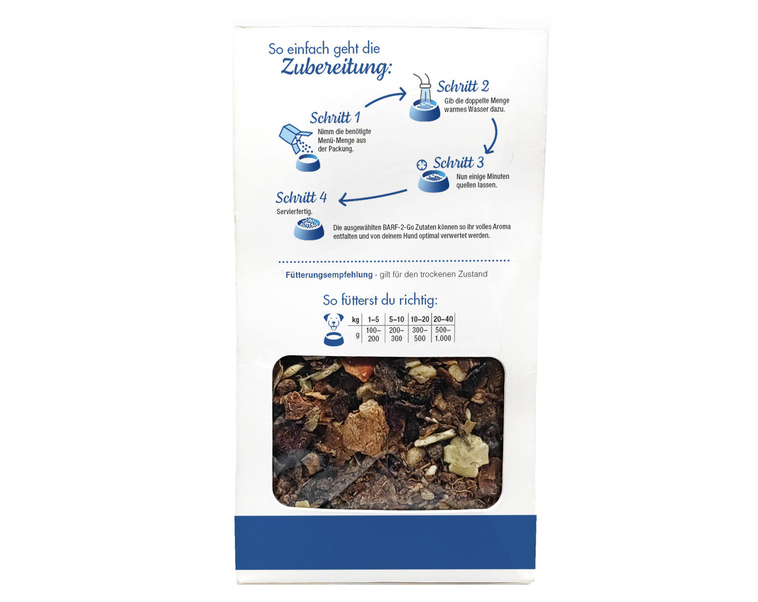 Damit die ausgewählten BARF 2 GO-Zutaten ihr volles Aroma entfalten und von Ihrem Hund optimal verwertet werden können, geben Sie etwas warmes Wasser zur gewünschten Menge der Menü-Mischung (ca. 200 ml auf 100 g Trockenmischung) und lassen die Mahlzeit für einige Minuten quellen.