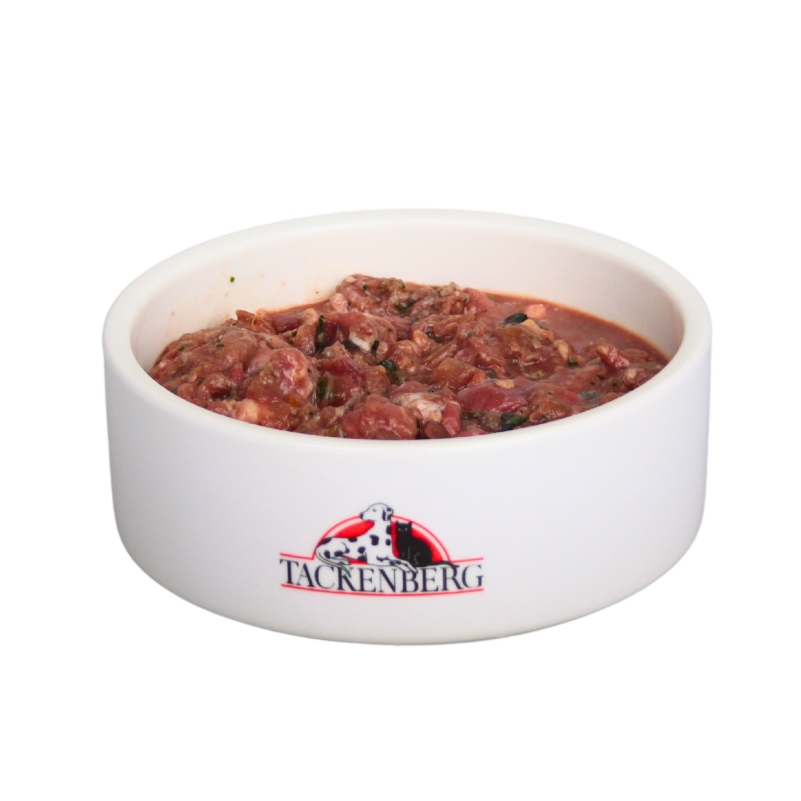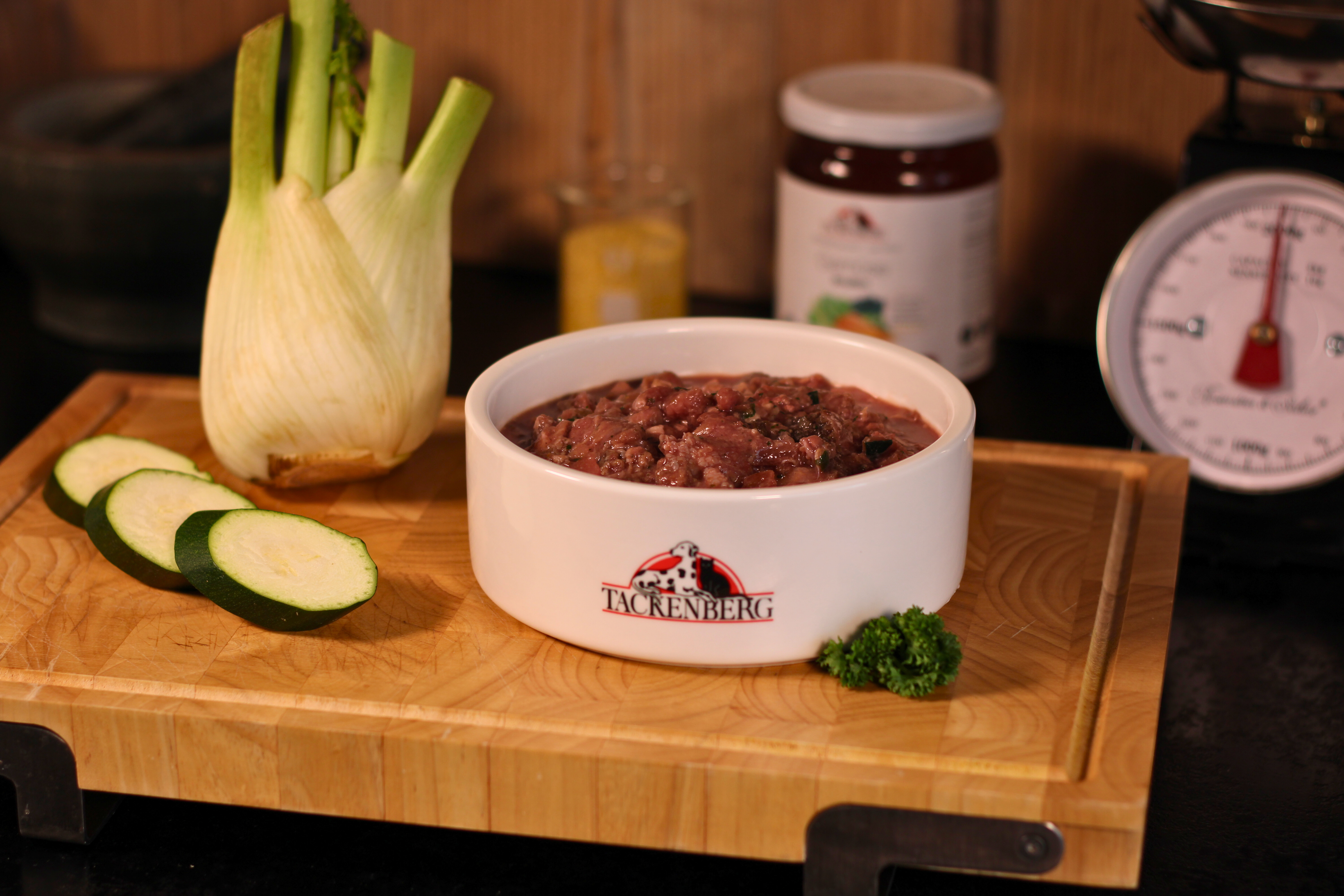 Um eine ausgewogene Mahlzeit zu gewährleisten, empfehlen wir bei Hunden ein Verhältnis von ca. 80 % Fleisch und Innereien &, 20 % pflanzlicher Komponente.