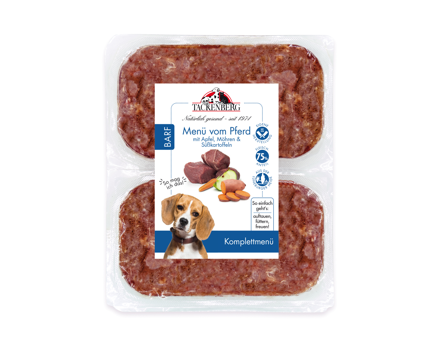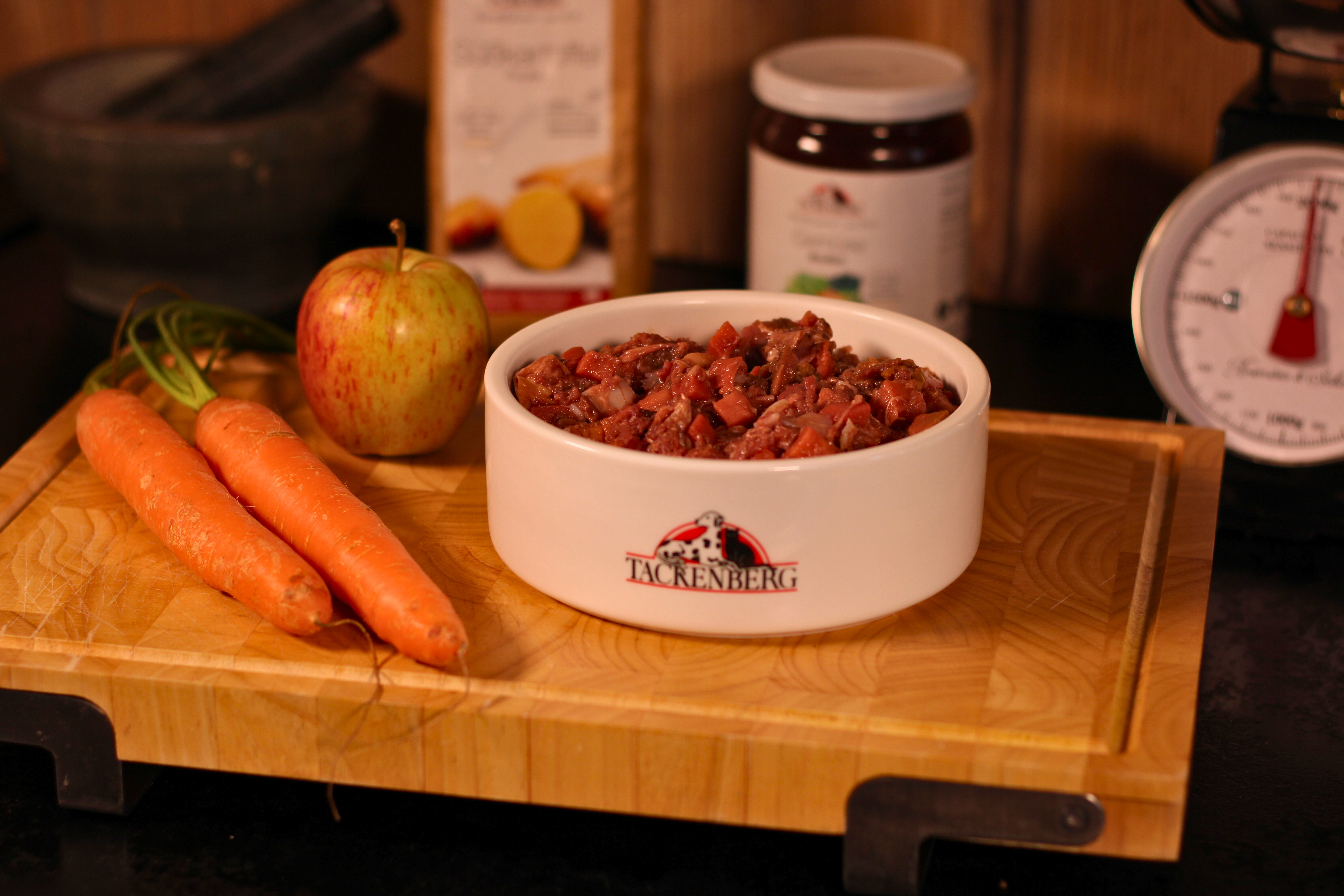 Das Festmahl ist angerichtet: Das servierfertige BARF Menü vom Pferd mit Apfel, Möhre & Süßkartoffel kombiniert schmackhaftes Pferdefleisch mit vitaminreichem Obst und Gemüse. Ein vollwertiges Mahl, das auch für empfindliche Hundemägen geeignet ist.