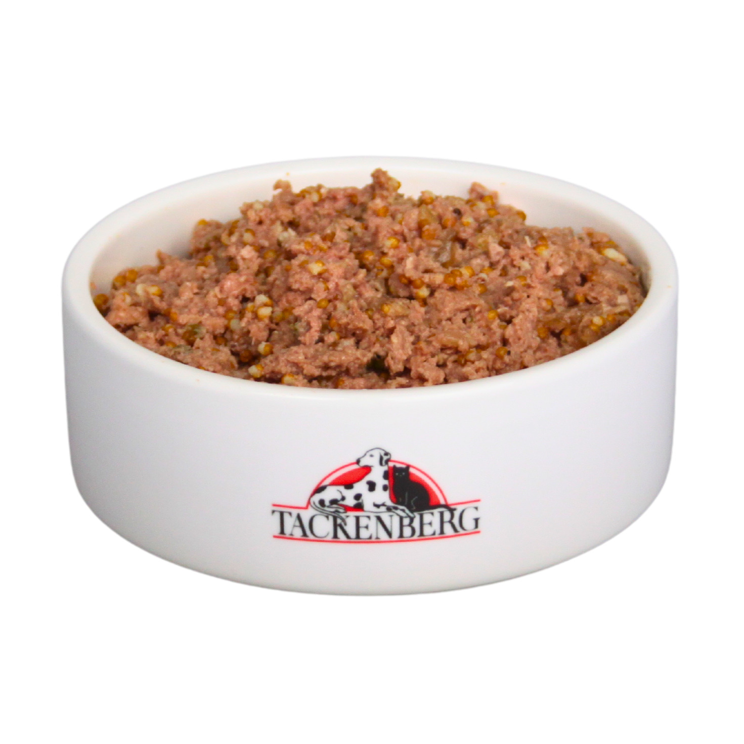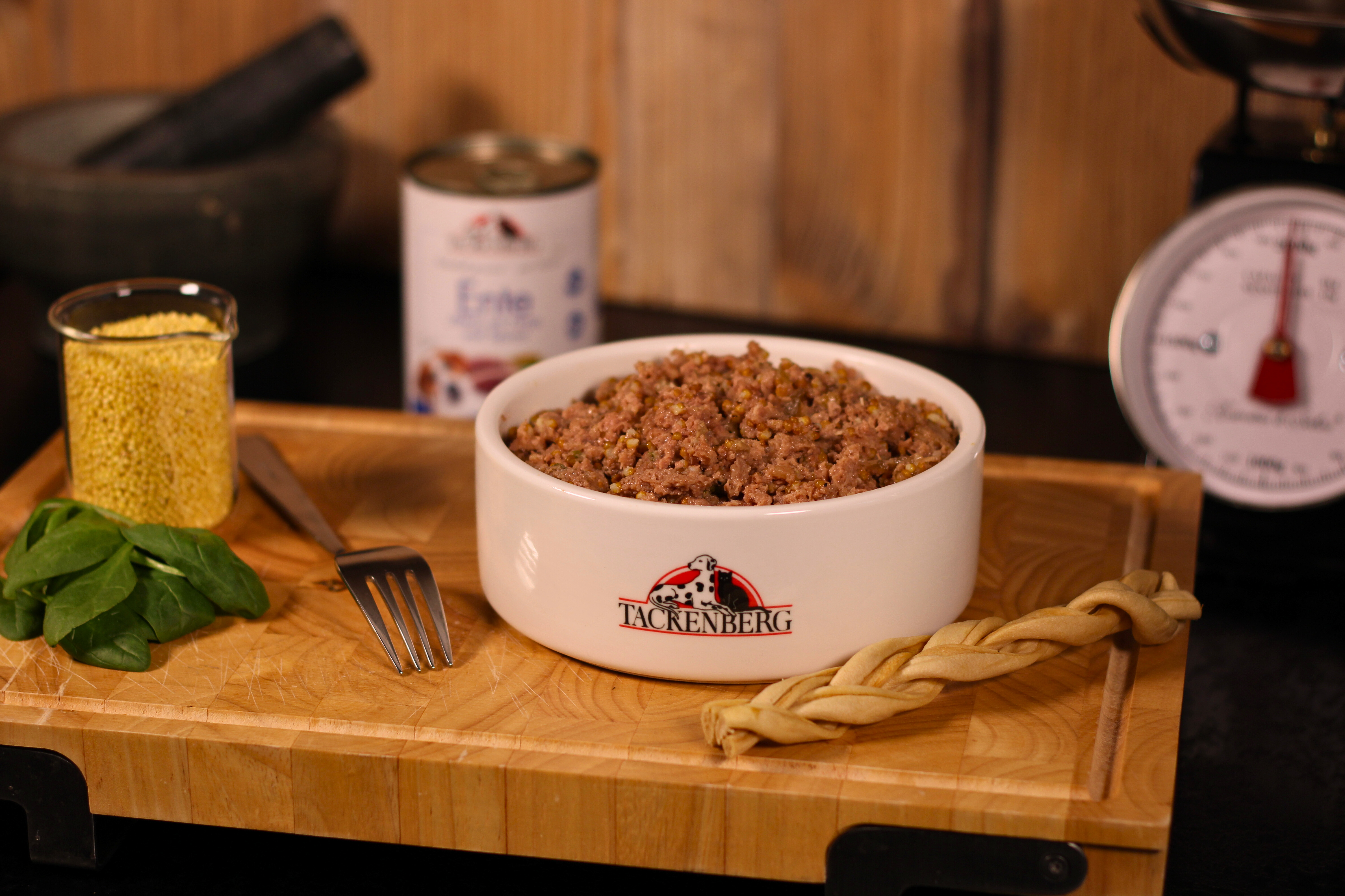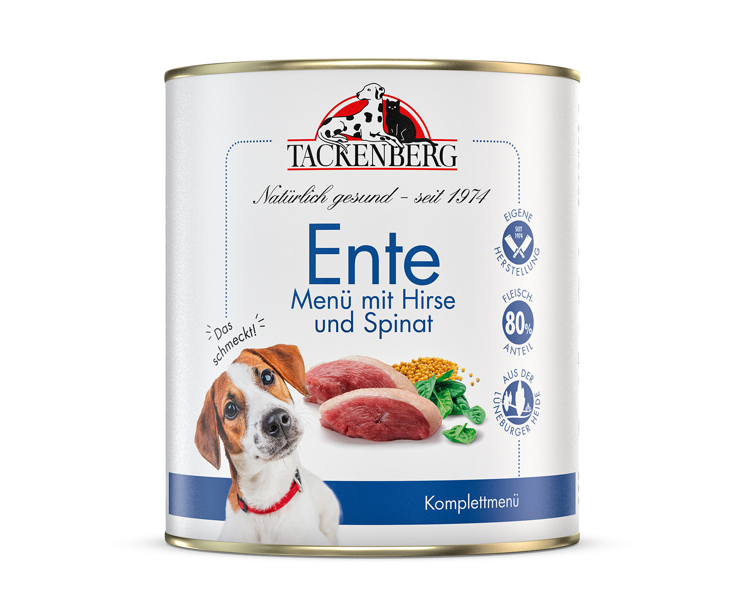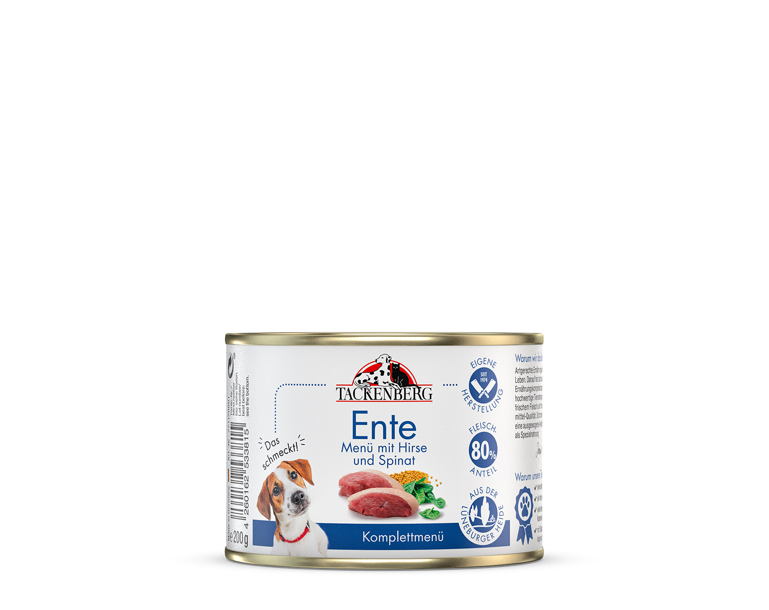 Saftiges Fleisch und gehaltvolle Innereien - unser Premium-Dosenfutter Ente mit Hirse und Spinat macht hungrige Vierbeiner glücklich. Die Premium Dose in bewährter TACKENBERG-Qualität steckt voller natürlicher Zutaten und viel, viel schlachtfrischem Geflügel. Für eine nahrhafte und gesunde Ernährung deines Lieblings.