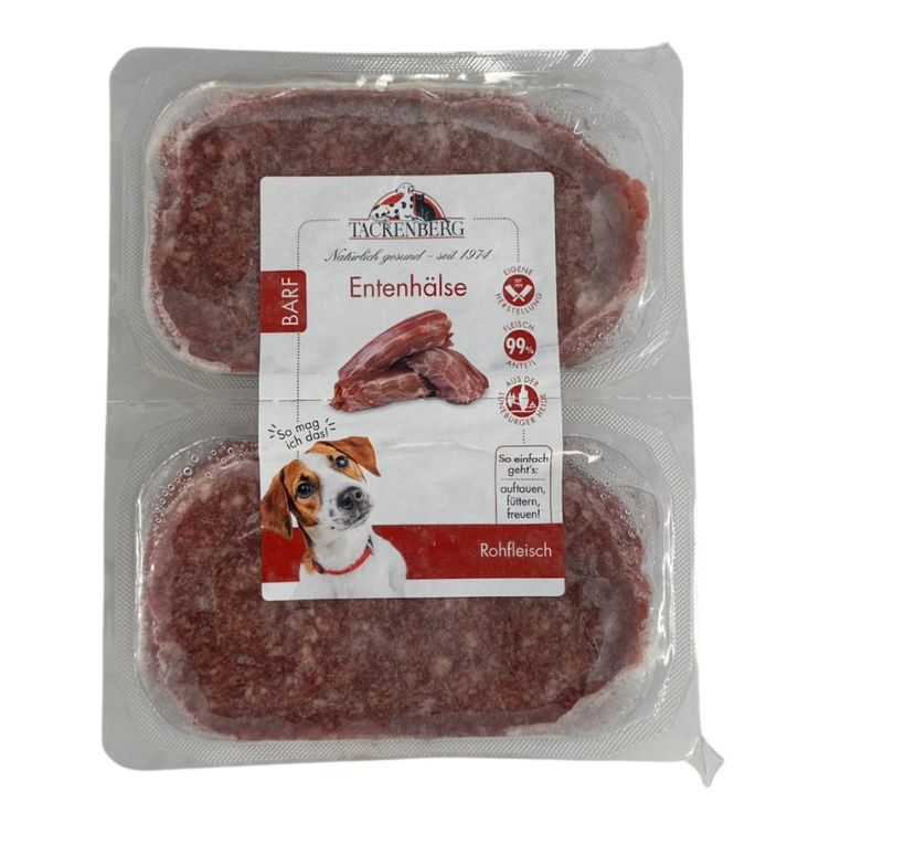 Unsere TACKENBERG Entenhälse enthalten noch viele gesunde Knochen und Knorpel - die idealen Calciumlieferanten. Das macht unsere Entenhälse zum perfekten Fleisch für Hunde und Katzen mit Calciummangel, und zwar bereits im Welpenalter ab dem dritten Monat.