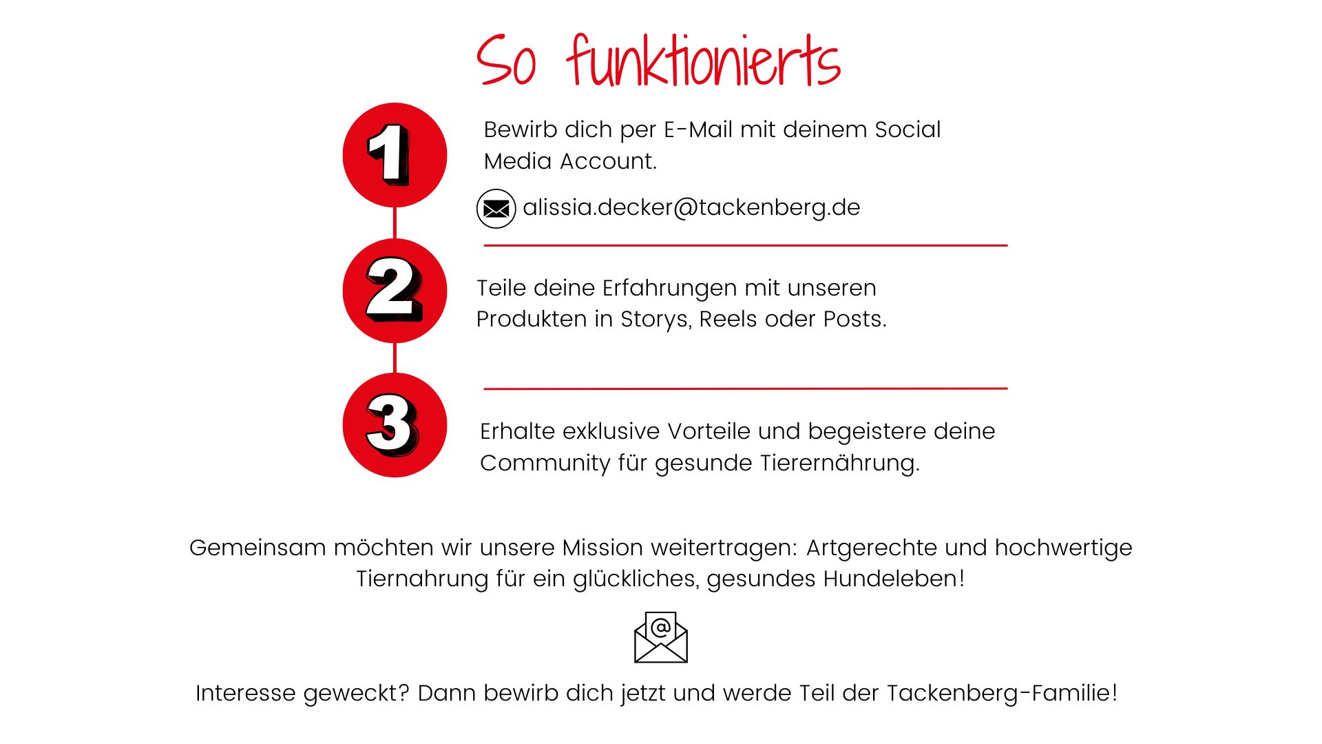 Du bist leidenschaftlicher Haustierbesitzer, liebst hochwertige Ernährung für deinen Vierbeiner und bist aktiv auf Social Media? Dann haben wir genau das Richtige für dich! Werde Markenbotschafter für Tackenberg und teile deine Begeisterung für unsere natürlichen und artgerechten BARF-Produkte mit deiner Community.