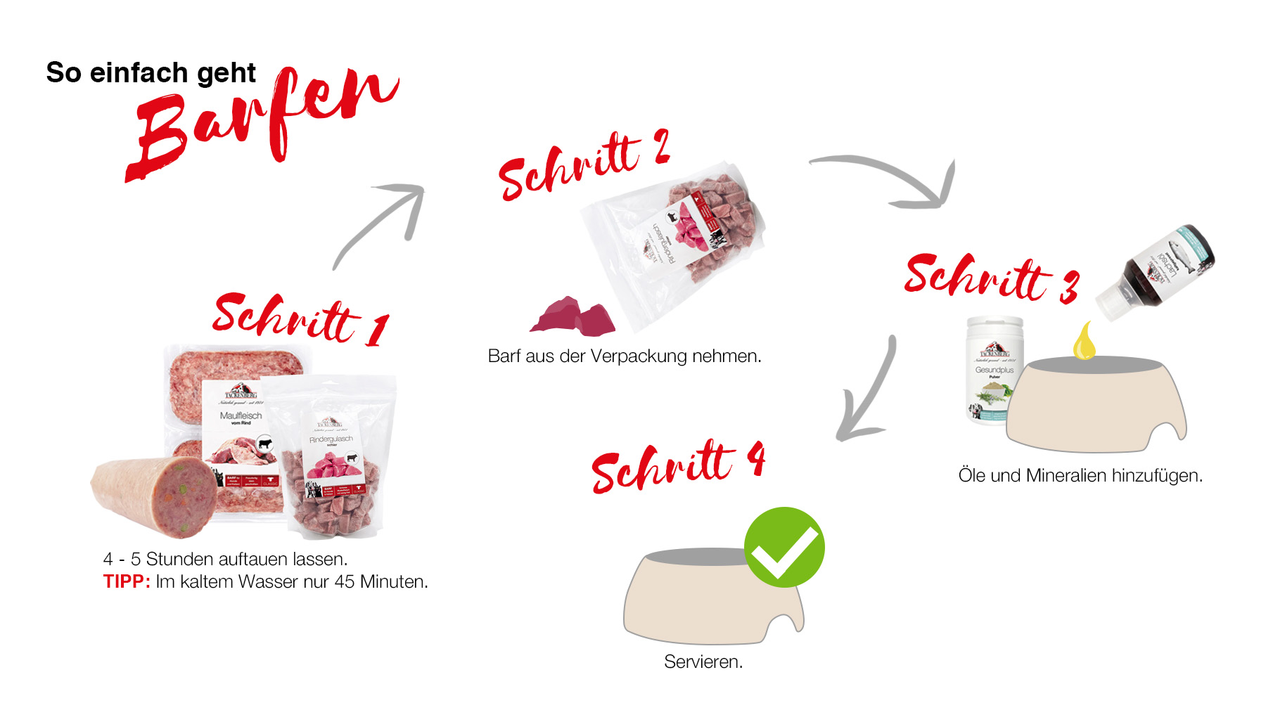 Tauen Sie die geschlossene Verpackung im warmen Wasserbad auf. Den enthaltenen Fleischsaft können Sie mitfüttern, er enthält wichtige Vitamine und Mineralien. Bitte achten Sie darauf, dass das Fleisch vollständig aufgetaut ist. Die ideale Temperatur für die Mahlzeit ist "handwarm". Bei einem Bedarf von weniger als der aufgetauten Menge können Sie den verbliebenen Rest bedenkenlos in einer Frischhaltedose einige Tage lang aufbewahren.