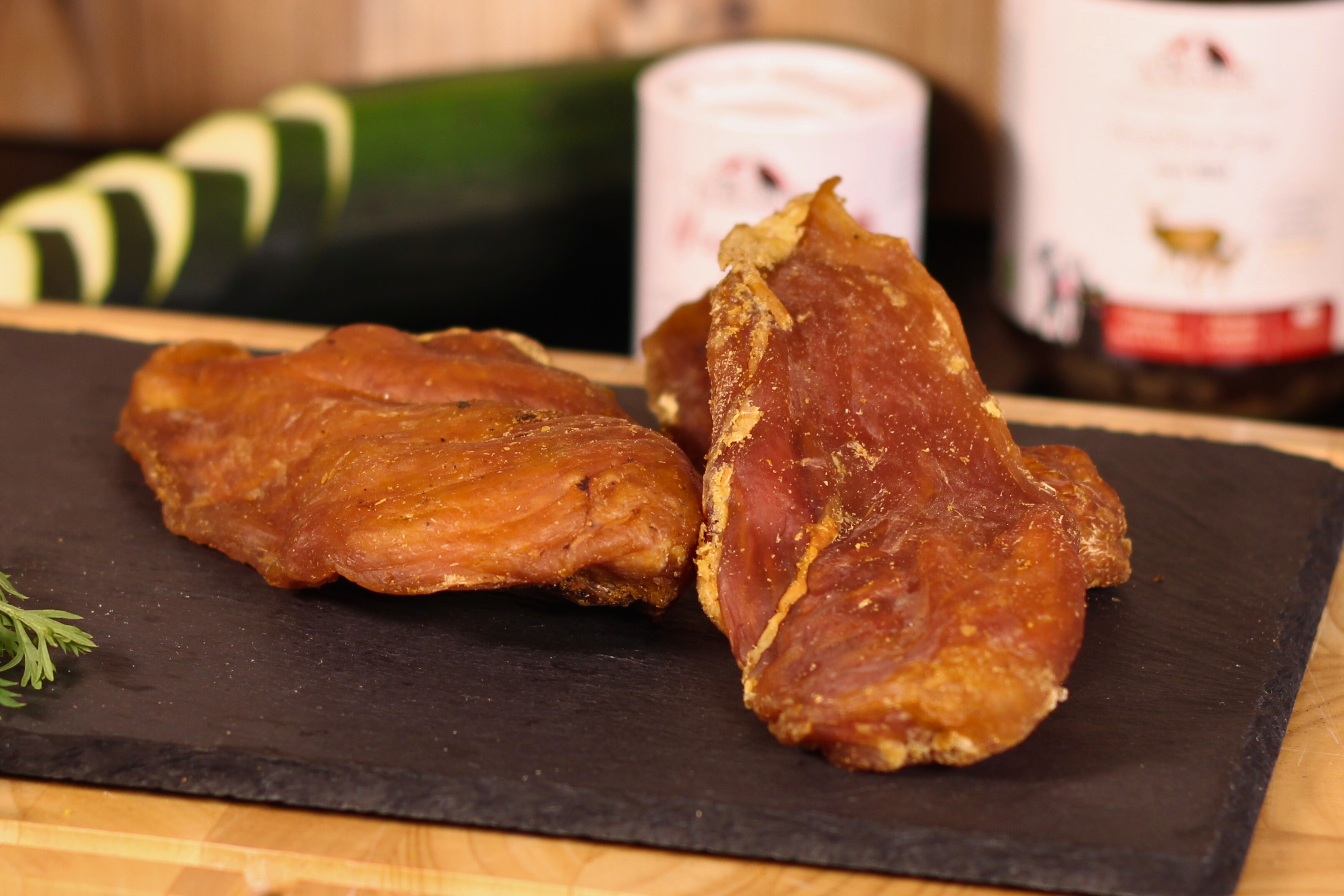 Rohes Huhn ist eine echte Delikatesse für Hunde und Katzen, doch getrocknetes Hühnerfleisch steht diesem in nichts nach: Das getrocknete Hühnerbrustfilet ist eine ganz besondere Leckerei für Ihren Vierbeiner, die sie ihm als Belohnung für zwischendurch geben können.