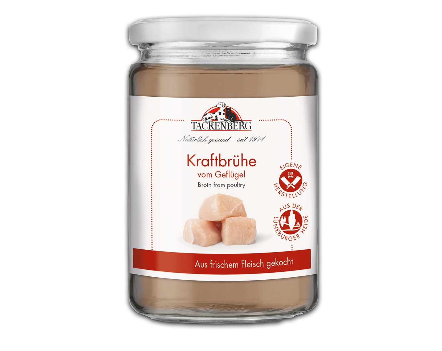 Gesund und aromatisch, ist die feine TACKENBERG Kraftbrühe vom Geflügel die natürliche Vollendung jeder Mahlzeit für den Hund und die Katze.