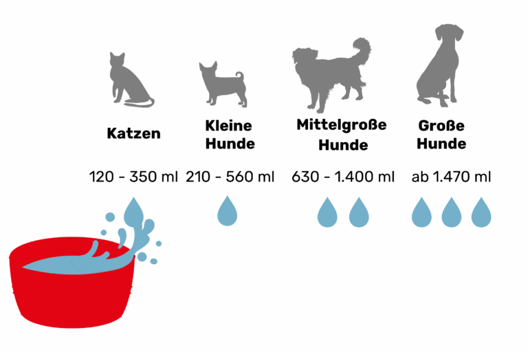 Beispiel: Ein 20kg schwerer Hund braucht etwa 1 bis 1,4 Liter Wasser täglich, eine 4kg Katze etwa 200–250 ml. Hier haben wir eine Übersicht für Dich, um besser einschätzen zu können, wie viel Wasser Dein Liebling benötigt: