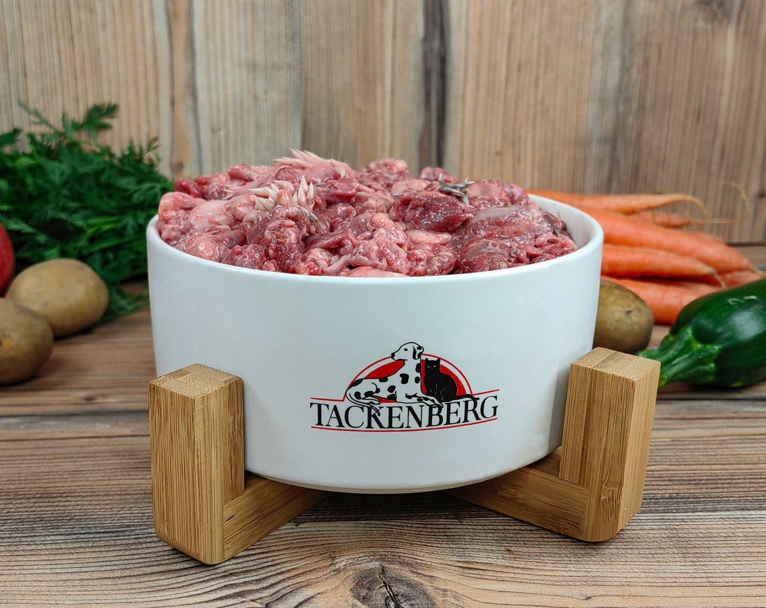 Um eine ausgewogene Mahlzeit zu gewährleisten, empfehlen wir bei Hunden ein Verhältnis von ca. 80 % Fleisch und Innereien und 20 % pflanzlicher Komponente.