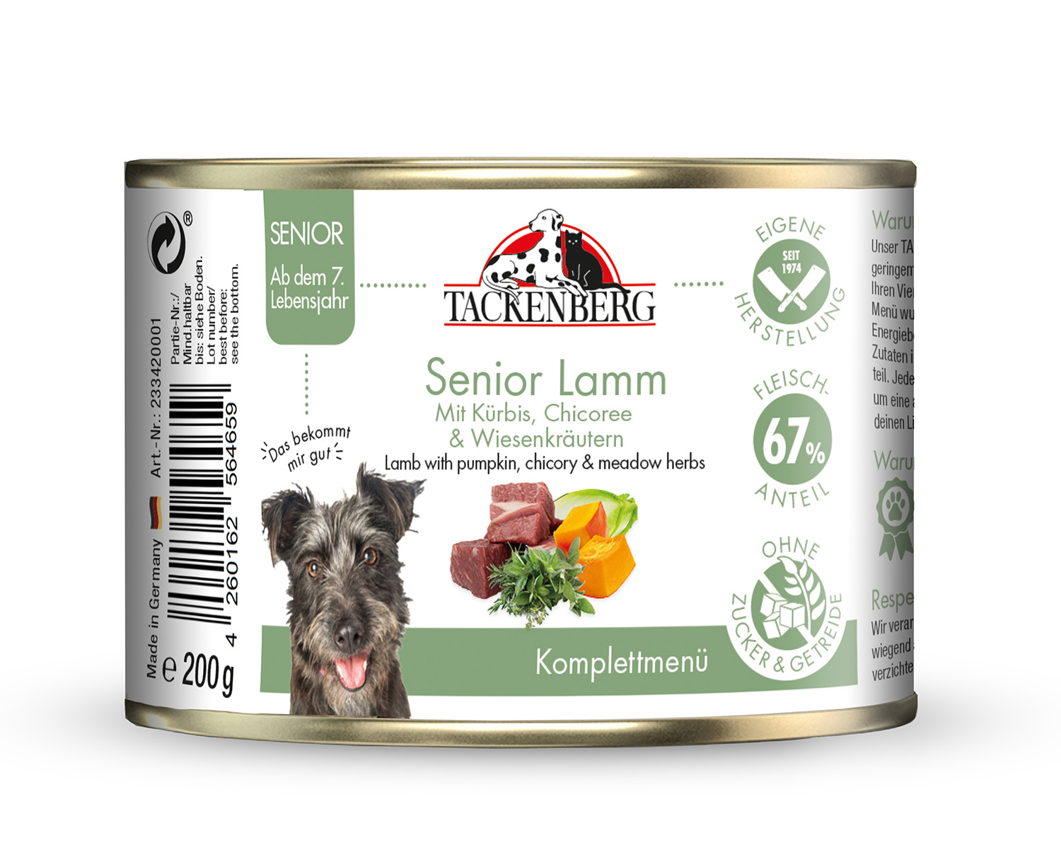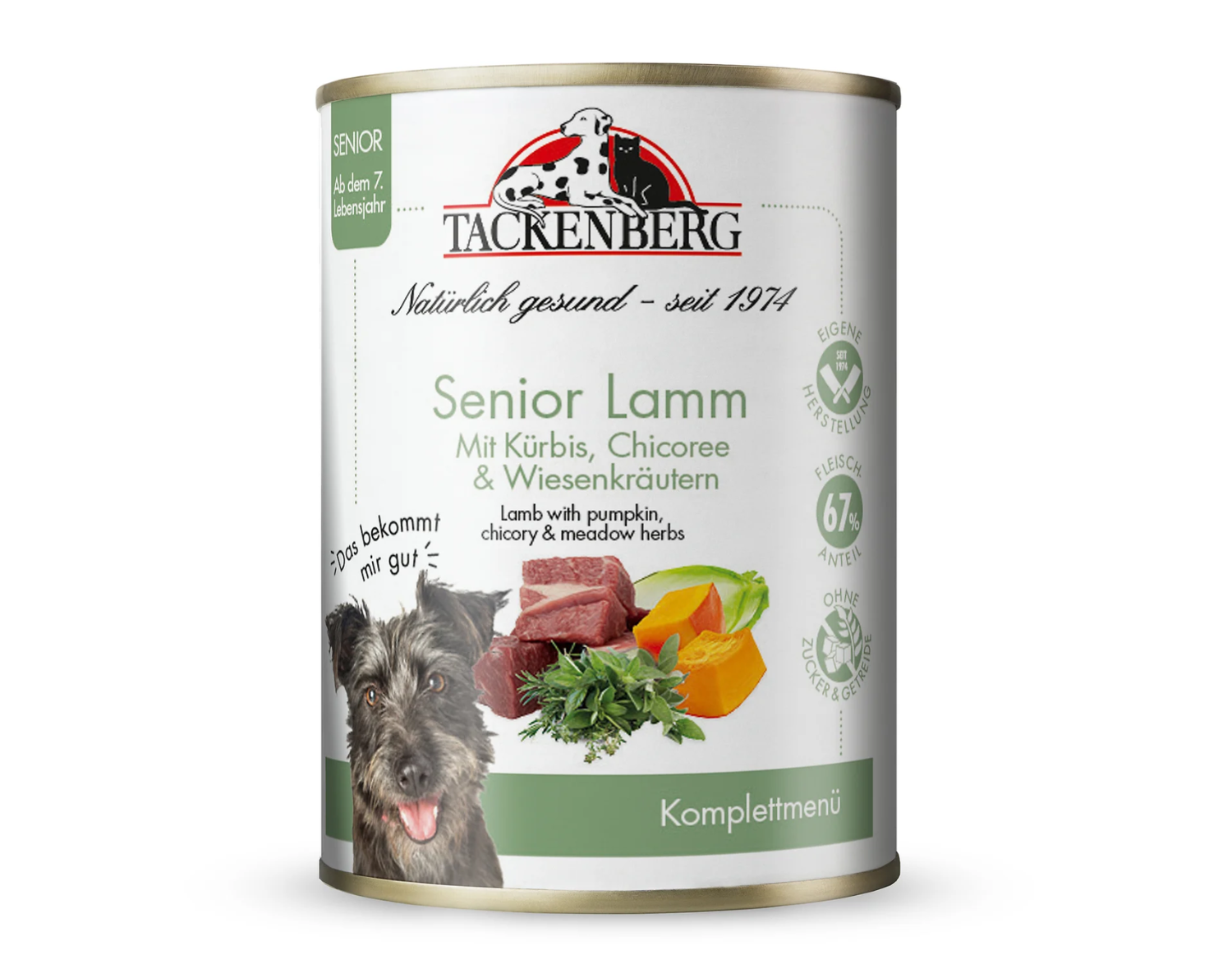 Hochwertiges Lammfleisch kombiniert mit naturgesundem Kürbis und feinen Wiesenkräutern bietet deinem Senior eine ausgewogene Mahlzeit speziell abgestimmt auf seine anspruchsvollen Bedürfnisse. Das neue Dosenmenü für Senioren mit seinen hochwertigen Zutaten und seiner ausgewogenen Zusammensetzung bietet eine gesunde und leicht verdauliche Mahlzeit für deinen Vierbeiner.