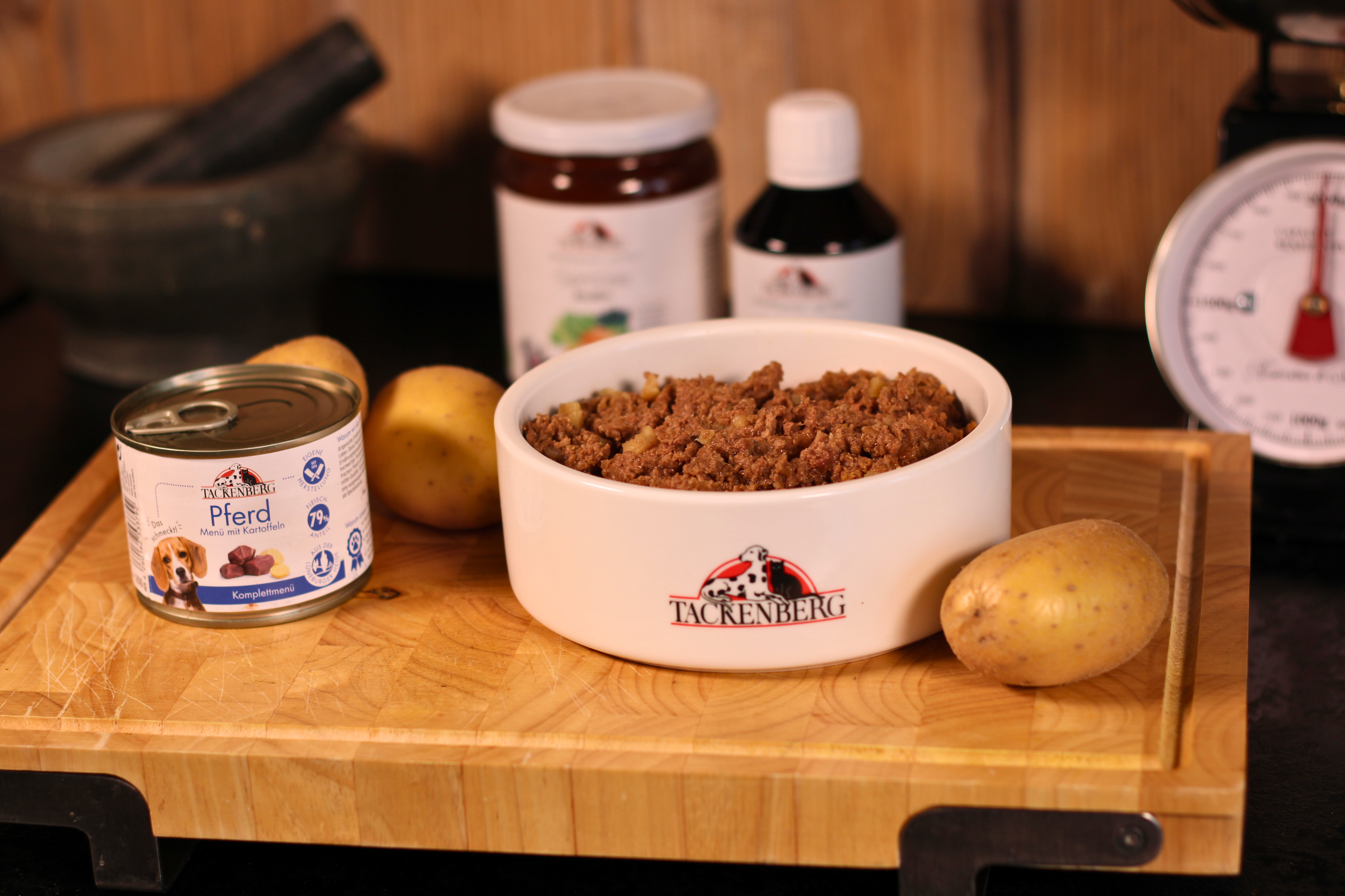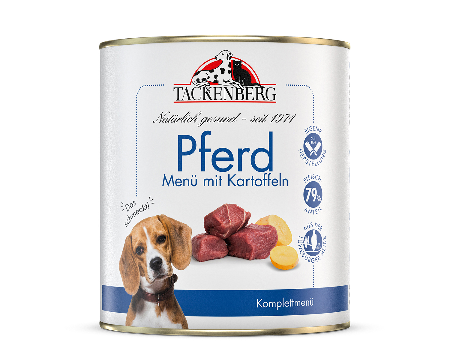Pferdefleisch gewinnt in der Hunde- und Katzenfütterung zunehmend an Bedeutung. Kein Wunder, denn diese Fleischsorte ist nicht nur besonders schmackhaft, sondern auch außergewöhnlich gut verträglich. Auch für allergische Vierbeiner ist Pferdefleisch ideal. In Kombination mit milden, bekömmlichen Kartoffeln ist unsere Premium Dose deshalb das ideale Alleinfutter für alle Hunde und Katzen mit Verdauungsproblemen oder Futterallergien. TACKENBERGS Premium Dosen werden unter regelmäßiger veterinärmedizinischer Kontrolle hergestellt. Selbstverständlich wird dabei auf Lockstoffe, Farbstoffe, Aromastoffe, Konservierungsstoffe, Füllstoffe sowie Knochen- und Fleischmehle verzichtet. Die Premium Dosen sind daher auch besonders ergiebig - und die ideale Alternative zum BARF, wenn es mal schnell gehen muss. Mit dem praktischen Pull-Ring sind die Dosen kinderleicht zu öffnen. Dein Vierbeiner ist futterempfindlich, soll aber auf ein echtes Geschmackserlebnis nicht verzichten müssen? Dann ist TACKENBERGS Premiumdose Pferd und Kartoffel erste Wahl!