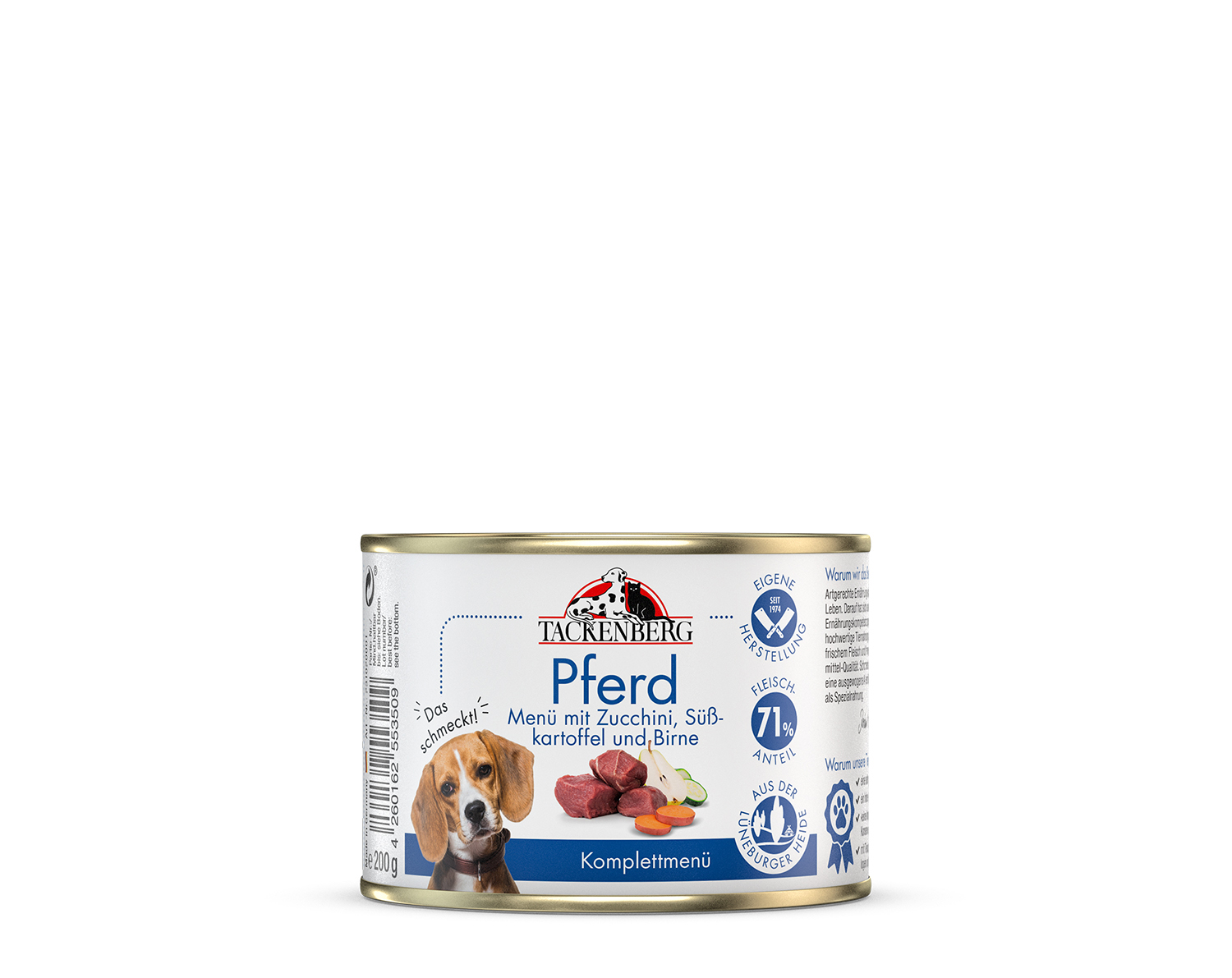 Dieses herzhafte Menü ist auch für futtersensible und allergische Vierbeiner geeignet: Die schmackhafte Kombination von saftigem Pferd mit feldfrischer Zucchini und erntefrischer Süßkartoffel verfeinert mit fruchtig-saftiger Birne mundet sicher auch deinem Liebling. Zudem ist das Menü in der praktischen Dose unterwegs und für viel beschäftigte Hundehalter leicht geöffnet und schnell gefüttert. Das hochwertige Nassfutter stellen wir in unserer Futtermanufaktur schonend und aus besten Zutaten her und das garantiert ohne Lock-, Farb-, Aroma-, Füll- und Konservierungsstoffe oder Zuckerzusatz.