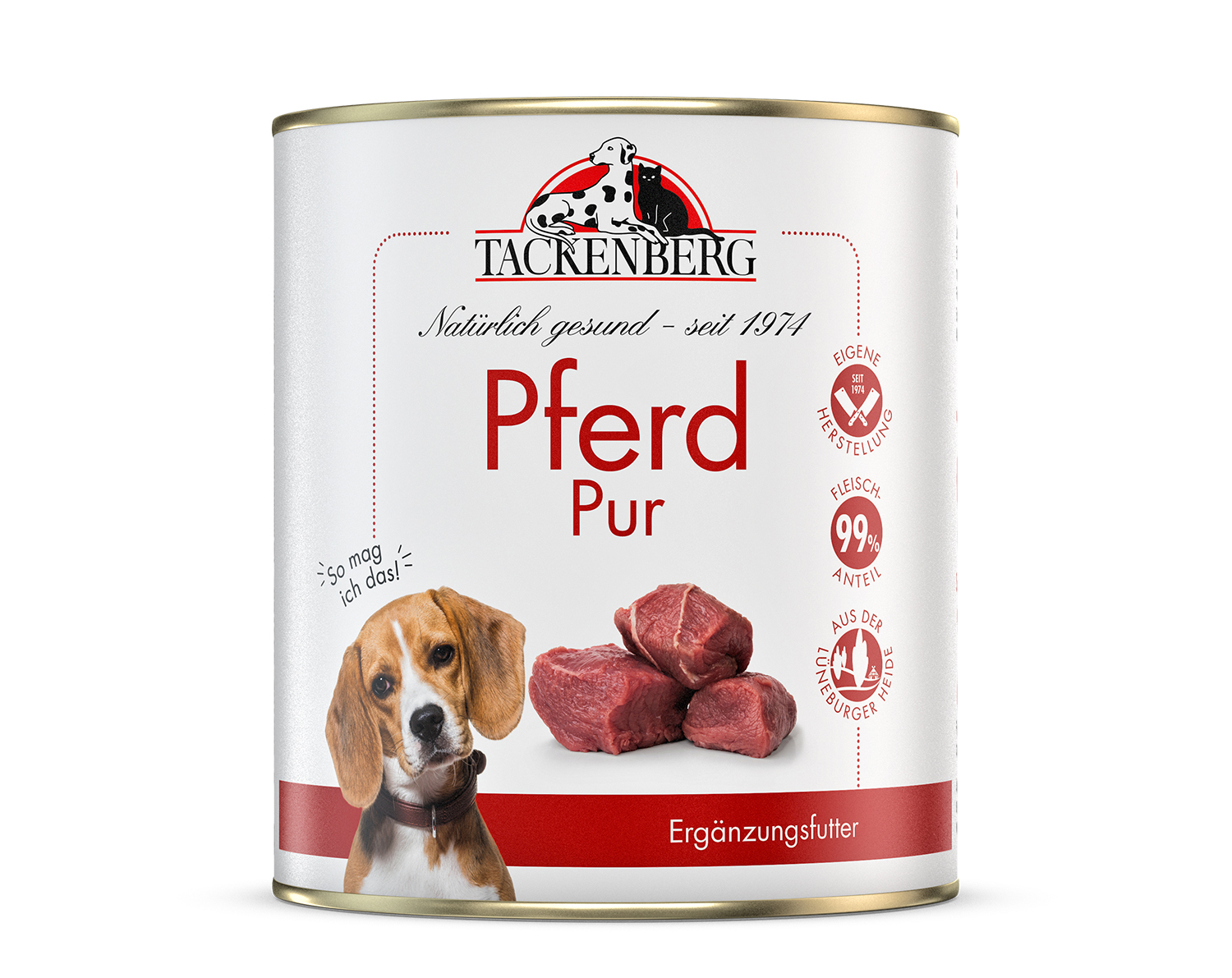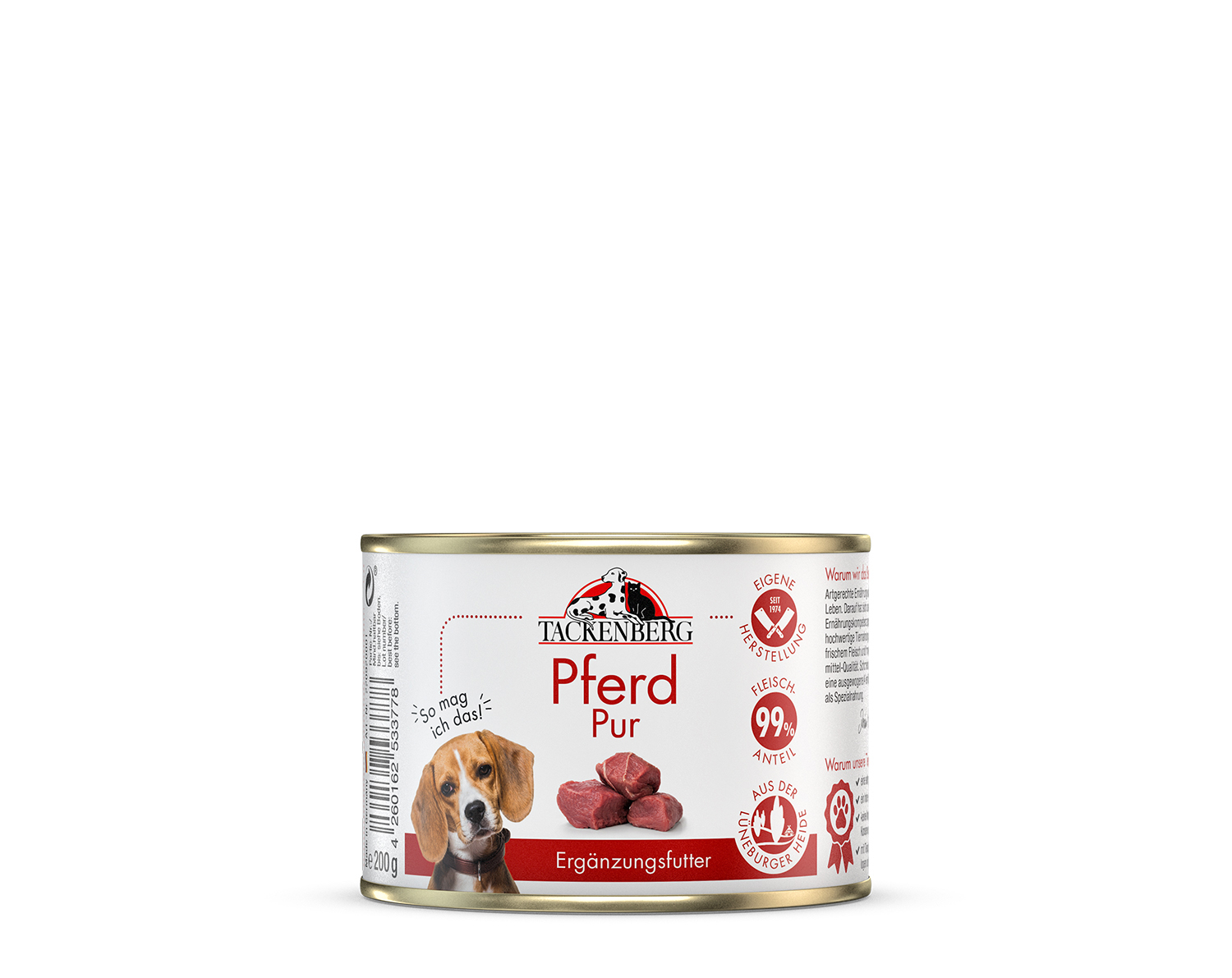 Ein wahres Festmahl für deinen Vierbeiner: Pures Pferdefleisch ist die exquisite Delikatesse für Hunde und Katzen mit feinem Gaumen. Das nahrhafte Fleisch der Pferde steckt nicht nur voller Vitalstoffe, es ist auch fettärmer als alle anderen Fleischsorten. Die feinfaserige Konsistenz ist ähnlich wie die des Rindfleischs - es schmeckt jedoch weit würziger und ein wenig süßlicher - ideal für Hunde und Katzen, die beim Fressen oft mäkelig sind. Unsere naturgesunde TACKENBERG Premium Dose enthält ausschließlich zartes Fleisch von ungemästeten Pferden mit all seinen Vitaminen, Mineralstoffen und Aminosäuren. Schlachtfrisch verarbeitet und schonend in schützende Premium Dosen verpackt.