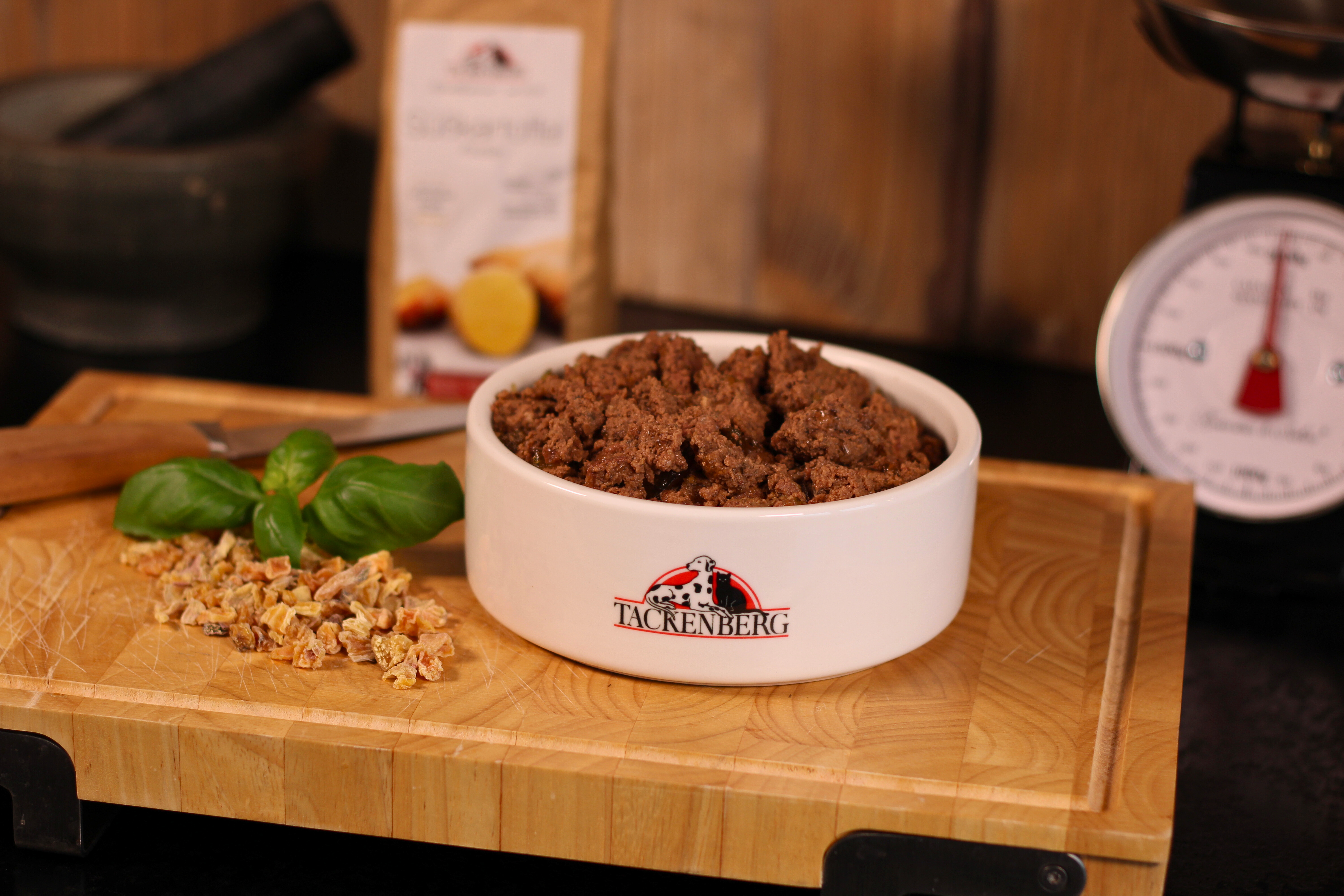 Um eine ausgewogene Mahlzeit zu gewährleisten, empfehlen wir bei Hunden ein Verhältnis von ca. 80 % Fleisch und Innereien & 20 % pflanzlicher Komponente.