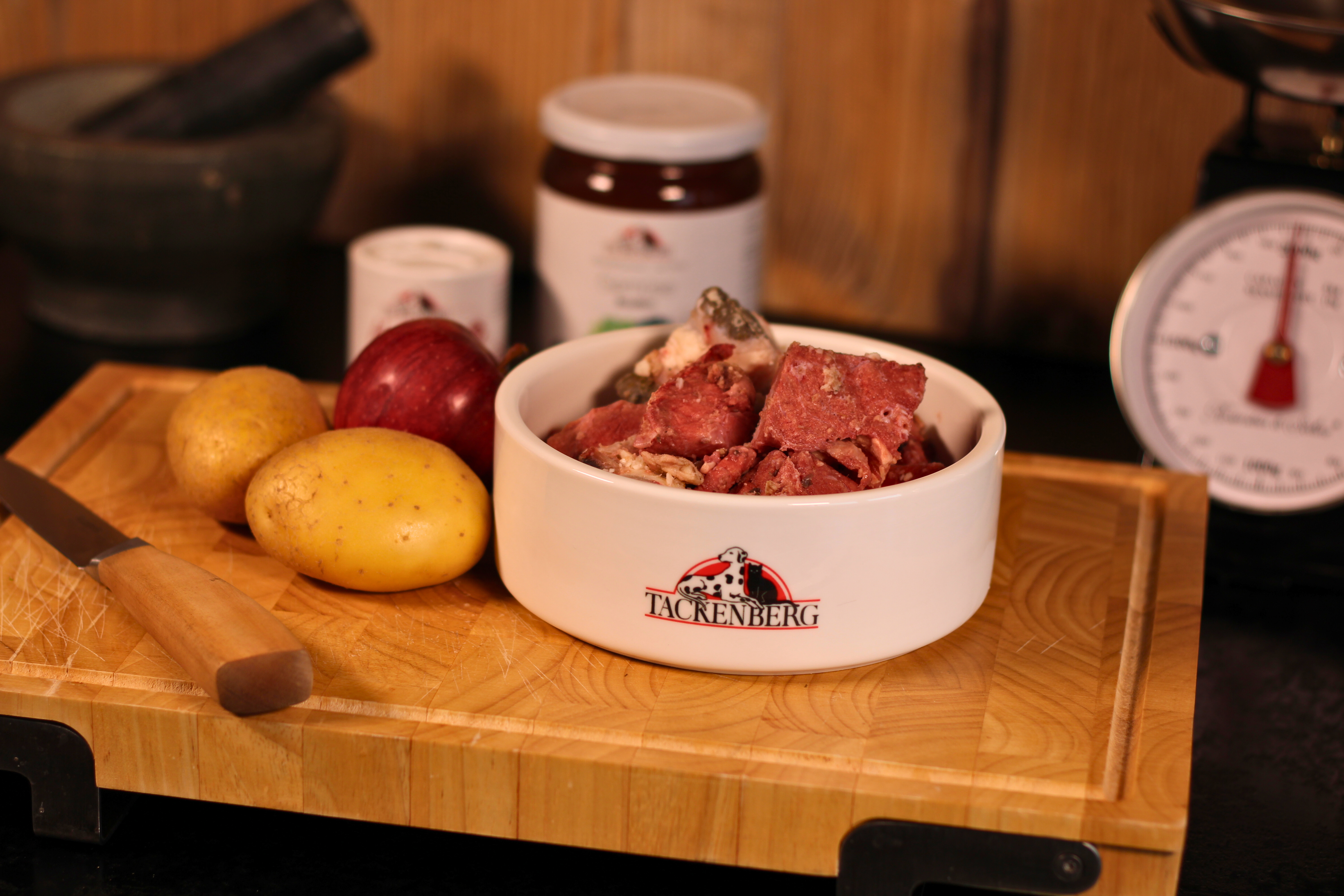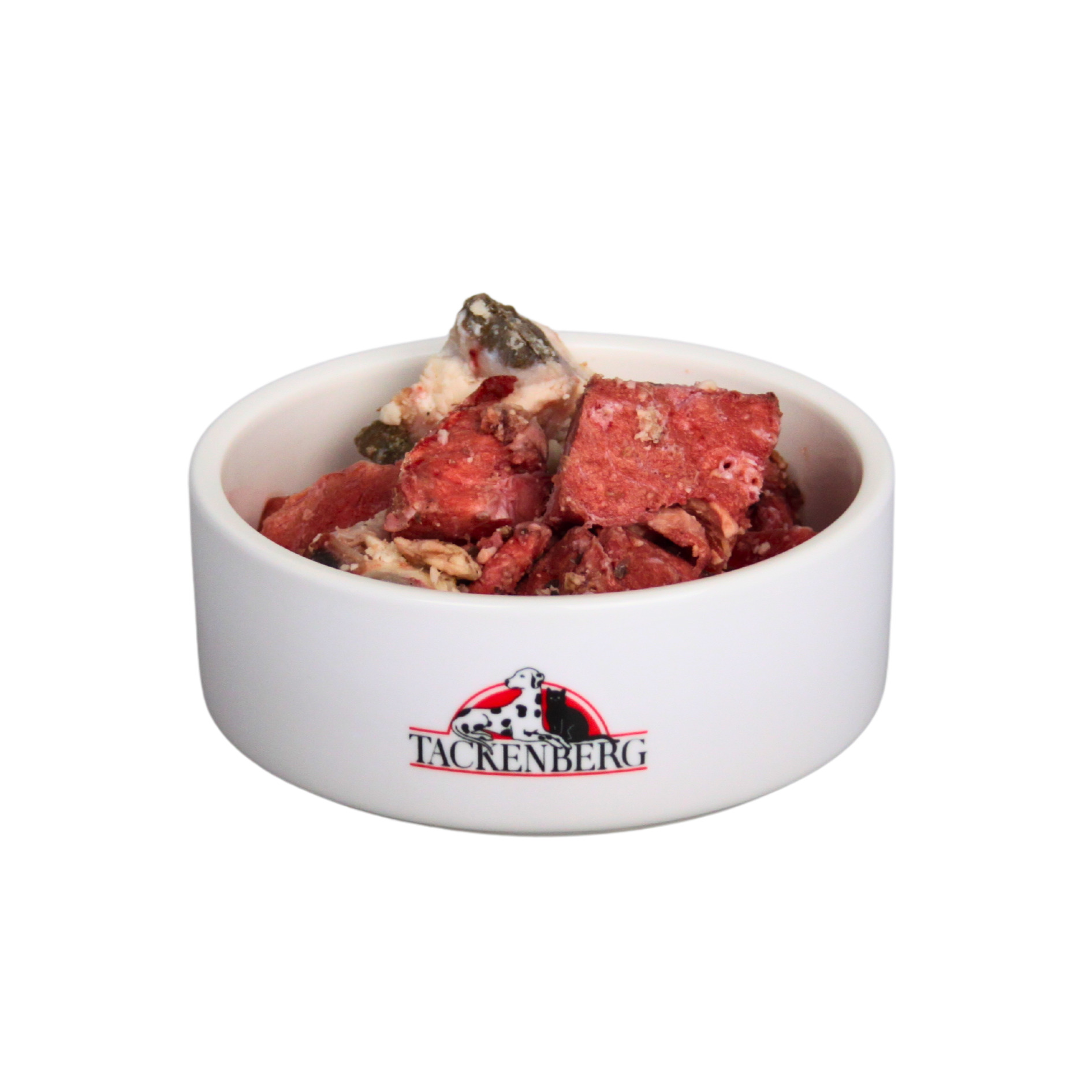 Eine BARF-Mahlzeit mit Liebesgeschichte: Vierbeiner aller Rassen sind seit über 35 Jahren ganz verrückt nach unserem TACKENBERG Rindermix. Das liegt an der harmonisch abgestimmten Zusammensetzung schmackhaft-frischer Zutaten – würziger Pansen, weiche Lunge sowie bissfestes Herz und Maulfleisch vereinen höchsten Genuss mit ausgiebigem Kauvergnügen. Unser Rindermix ist eine Rohfleischmischung, wie sie vielleicht auch in der freien Wildbahn auf dem Speiseplan Ihres Vierbeiners stehen würde. Ursprünglich, nahrhaft und artgerecht. Genau, wie eine perfekte BARF-Mahlzeit sein sollte.
