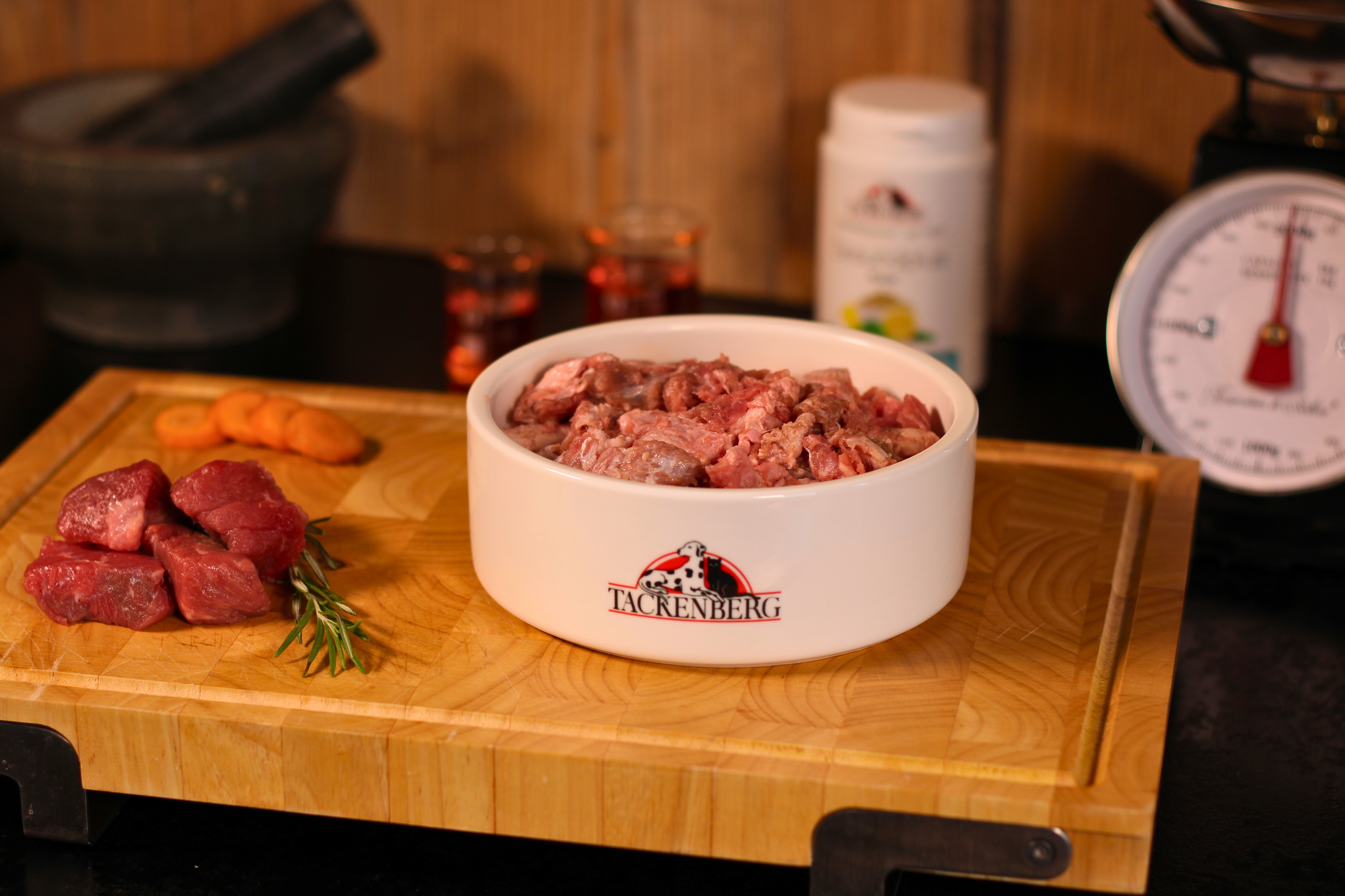 Ein Allround-Talent der Rohfleischfütterung: zart-festes Rindfleisch aus unserer TACKENBERG Futtermanufaktur. Schonend verarbeitet für eine schmackhafte BARF-Mahlzeit voller Vitamine.
