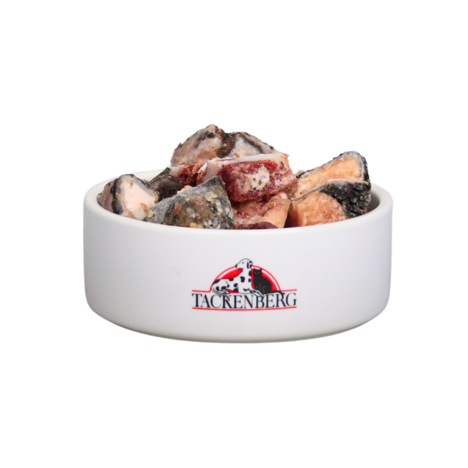 Der Pansen ist der größte Vormagen des Rindes und besteht aus Schleimhaut, Muskelgewebe und Bauchfell. Als Innerei ist er besonders wertvoll, da er pflanzliche Rückstände mit wertvollen Enzymen und nützlichen Bakterien enthält, die vor allem für die Darmgesundheit des Hundes sehr vorteilhaft sind. Außerdem ist grüner Pansen eine echte Vitaminbombe: Er ist reich an Vitamin A, Vitamin E, B-Vitaminen, Vitamin C, Vitamin D und Vitamin E; zudem enthält er Eisen, Fluor, Kupfer, Jod, Mangan, Zink, Calcium, Magnesium und Phosphor. Ein dreifaches Hoch auf diesen Fleischmix - Ihr Hund wird TACKENBERGS Tricolore von Rind & Huhn nicht widerstehen können!