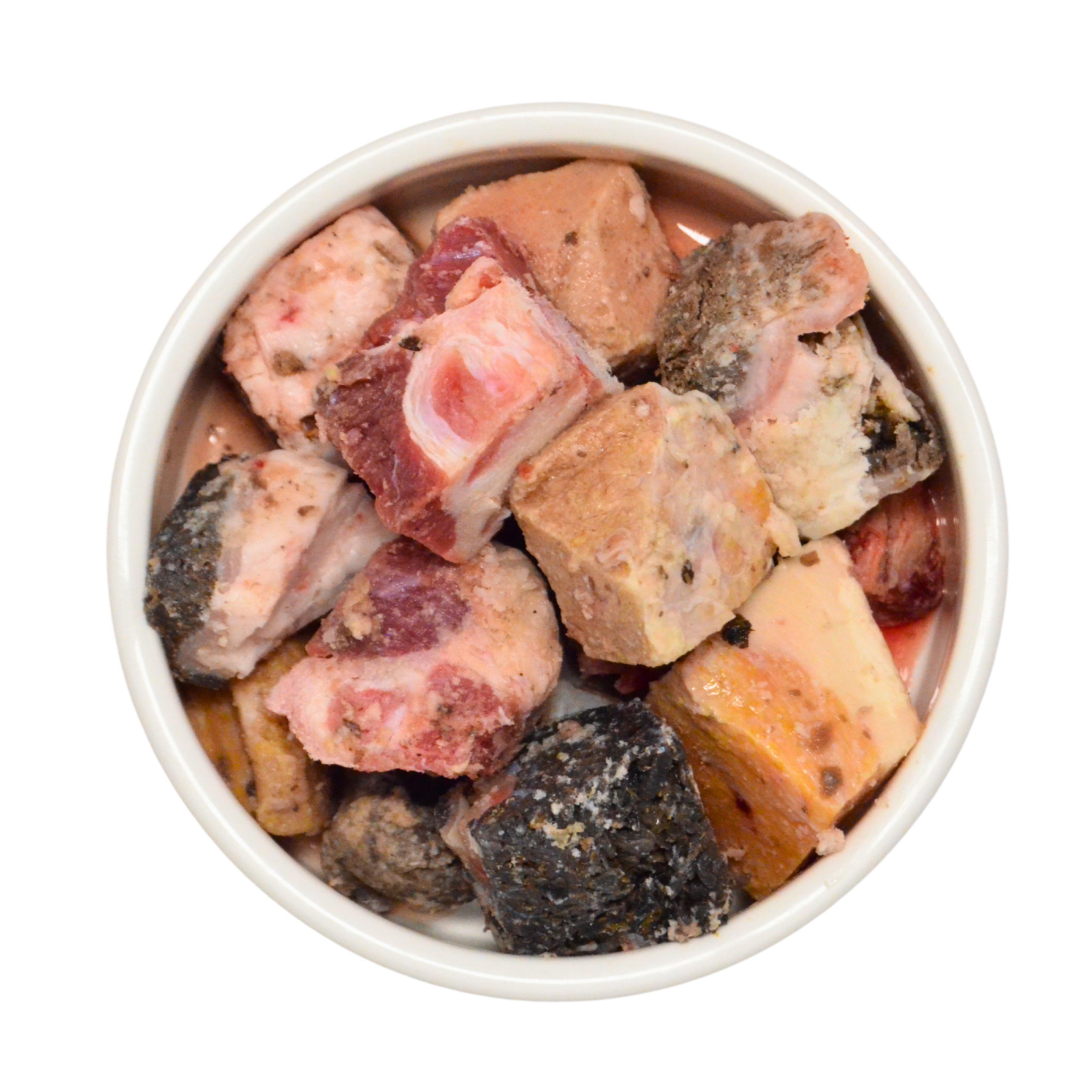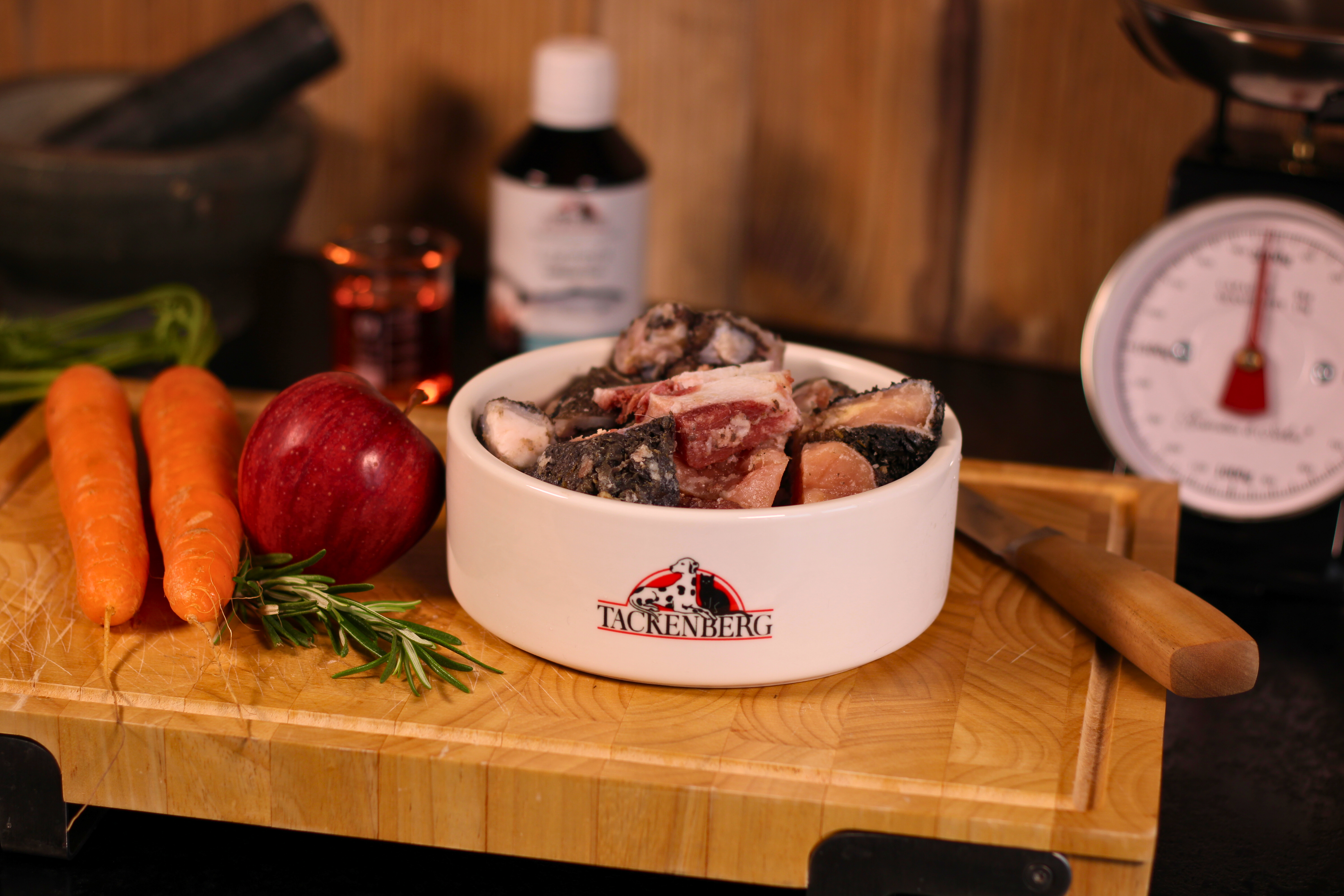Um eine ausgewogene Mahlzeit zu gewährleisten, empfehlen wir bei Hunden ein Verhältnis von ca. 80 % Fleisch und Innereien und 20 % pflanzlicher Komponente.