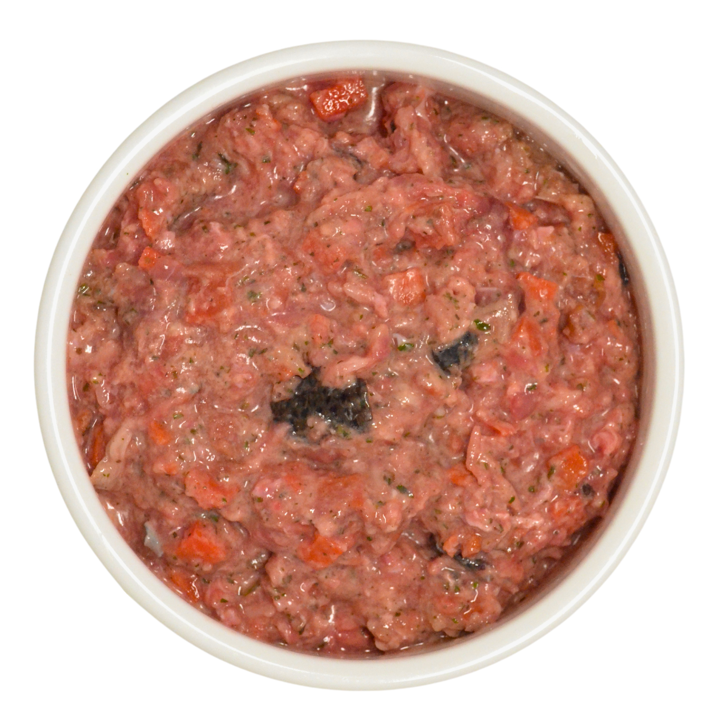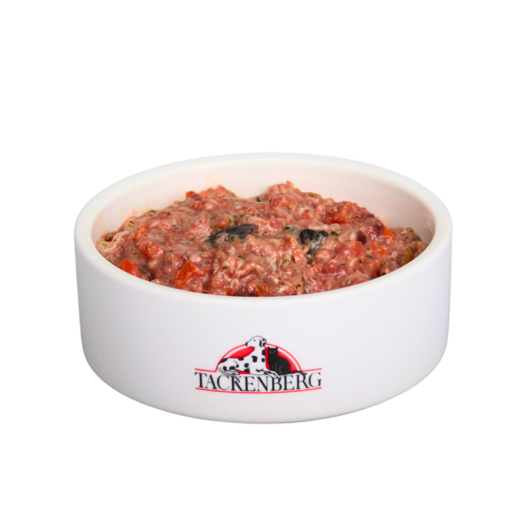 Um eine ausgewogene Mahlzeit zu gewährleisten, empfehlen wir bei Hunden ein Verhältnis von ca. 80 % Fleisch und Innereien & 20 % pflanzlicher Komponente.