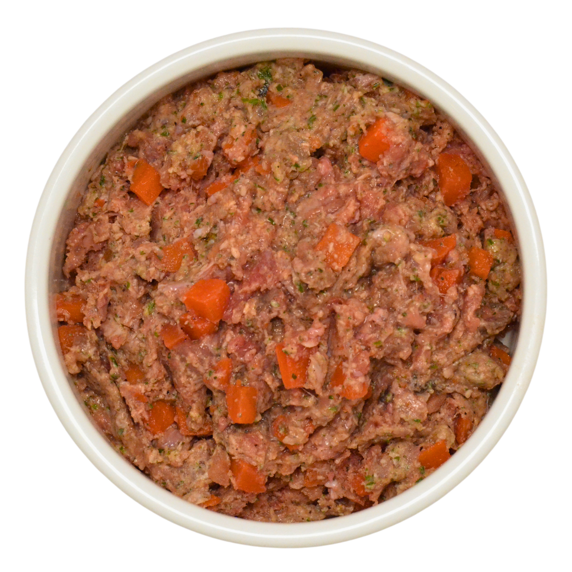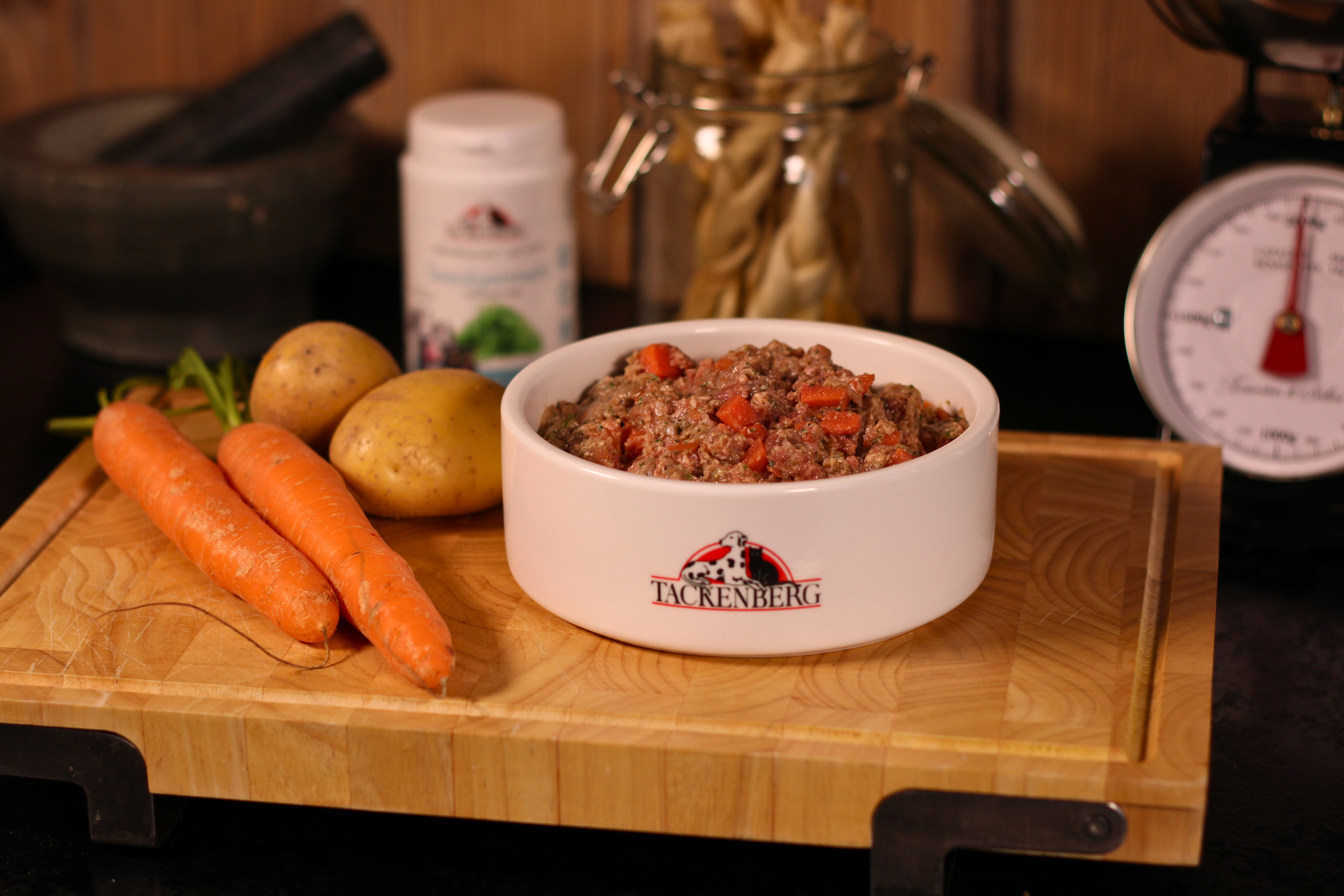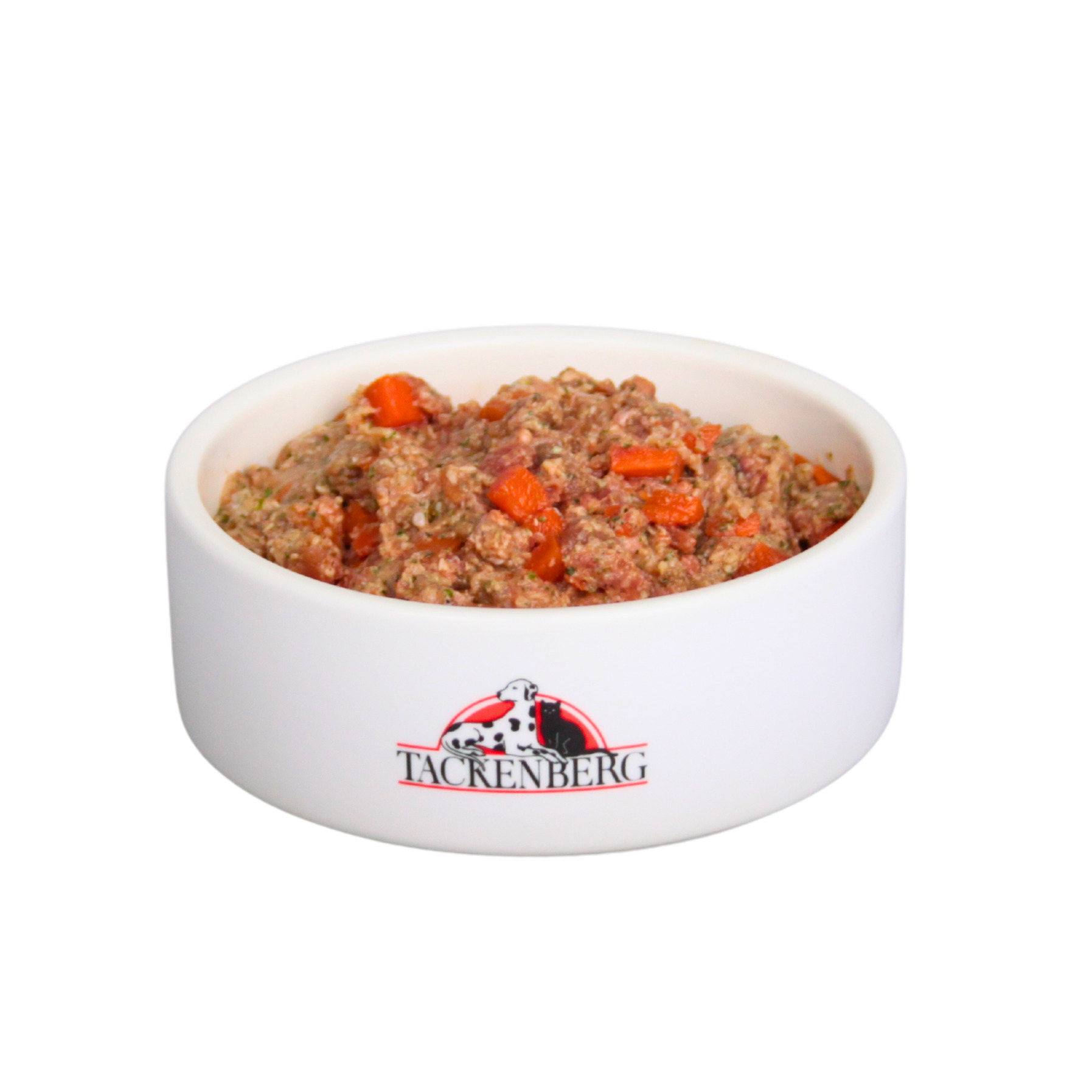 Um eine ausgewogene Mahlzeit zu gewährleisten, empfehlen wir bei Hunden ein Verhältnis von ca. 80 % Fleisch und Innereien & 20 % pflanzlicher Komponente.